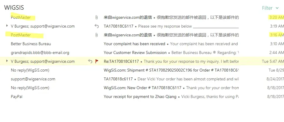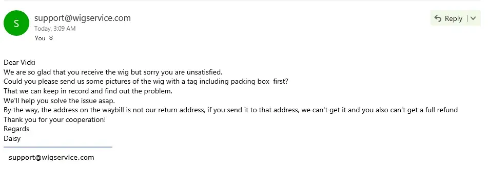 Asian company, email are nice but no solution yet, and scary the wig was sent from the middle east?