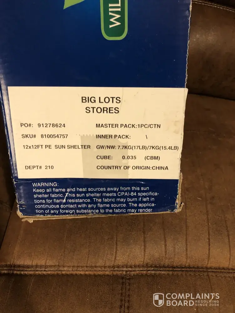 Brand New out of box Sun Shelter with Screen walls. Tent purchased from Big lots for a July 4 party. Put up and a light gust of wind broke plastic corner holders. Screen ripped. Parts were not fitting together properly and were so loose. It immediately fell to ground knocking all pieces apart. Cracked all plastic pieces and bent metal. Ruined all parts. No replacements in box. Very upset it didn't last 5 minutes.