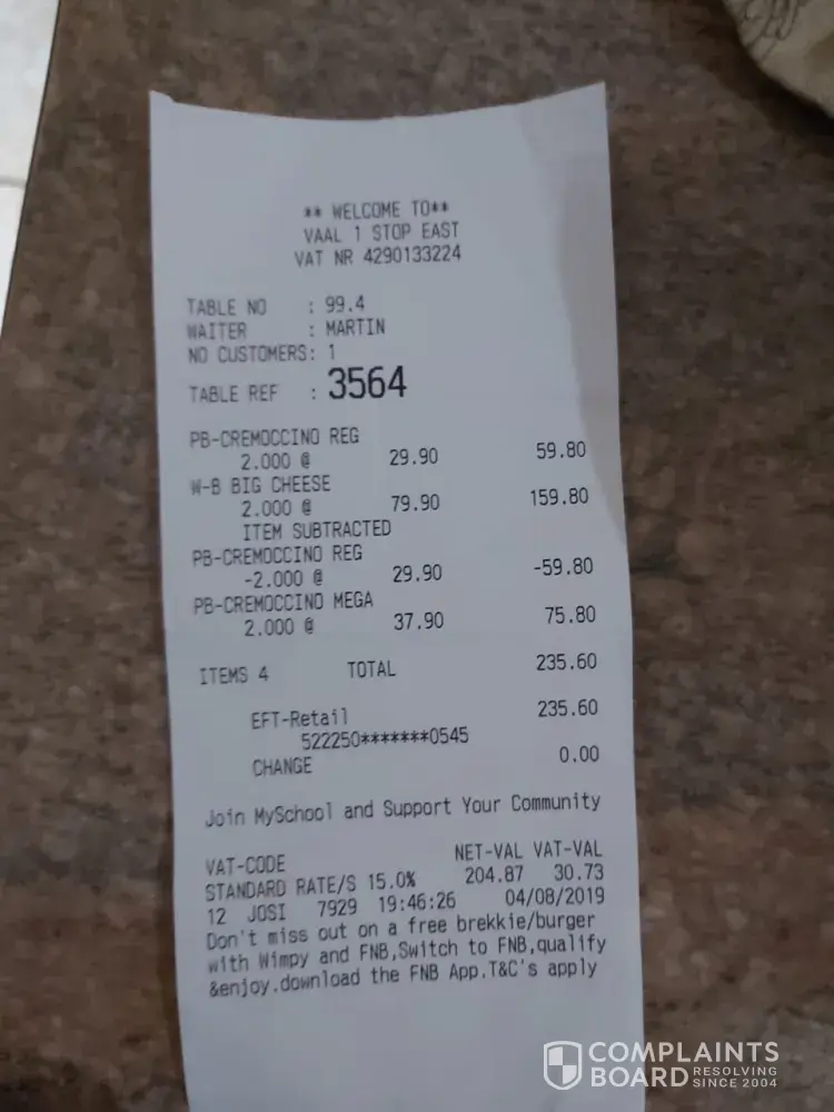 I visited a Wimpy near me on Saterday 20 July 2019. Waverley Plaza