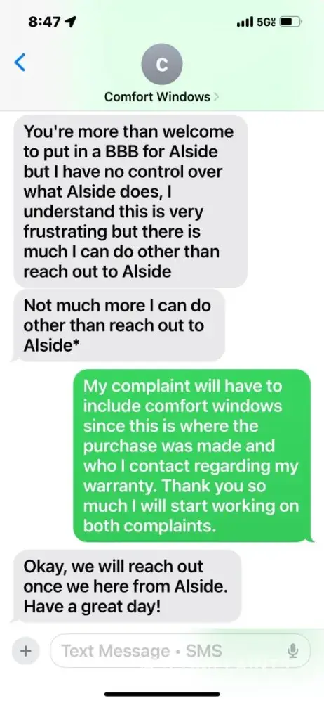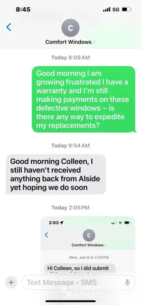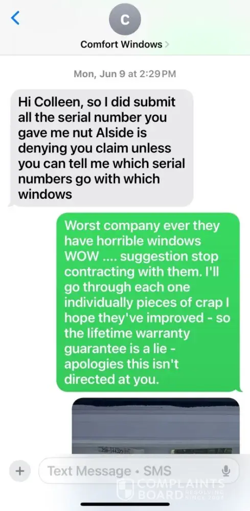 I purchased windows through Comfort Windows in Syracuse, NY, which were manufactured by Alside. Four of these windows developed defects that should be covered under the warranty. On June 4, I notified Comfort Windows of the issue. On June 5, I submitted photos of the defective windows. On June 9, I received a denial citing missing serial numbers. That...