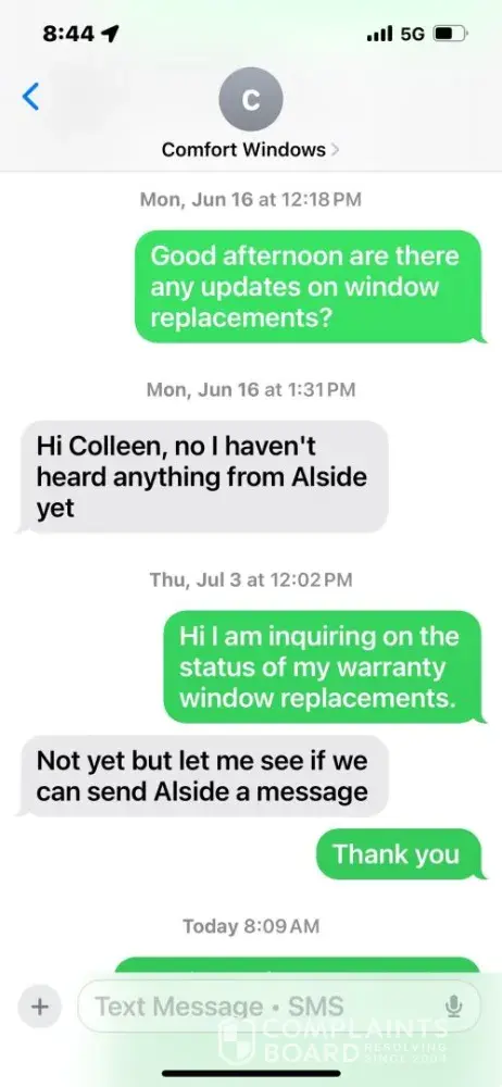 4/23/23 Submitted online request for service work on a screen door that was under warranty. Glass was broken and needs replacing. 4/25 Received call back, a message was left to return Comfort's call at Danielle's direct line. Return calls from me were made on 4/28, 5/1, 5/2, 5/3 some days multiple times. The general phone number at the Rochester office...