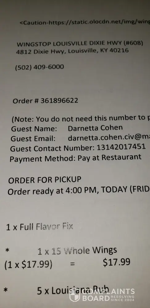 My name is Darnetta Cohen on Friday, 30 August 2019, I ordered 15pcs whole wing special w/large fries, 6 rolls, ranch and cheese sauce online from the Wingstop location at 4812 Dixie Hwy, Louisville, KY 40216 (502) 409-6000; store 608. I live nearly an hour away in Elizabethtown, KY. When I got there, food was ready, but when I checked, my fries were very...