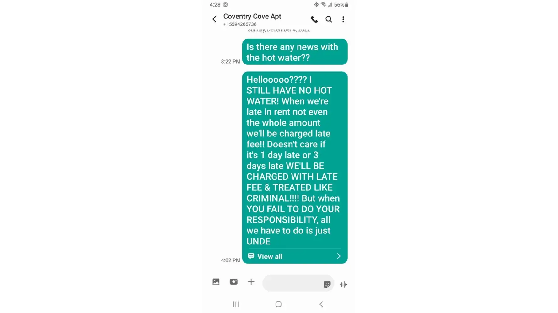 Everytime we have urgent issue like hot water not working during winter & they were being unresponsive, we just have to swallow it. We had to shower with cold water! But when it comes to late in payment (NOT EVEN WHOLE AMOUNT just $300 behind or $200 behind) we'll be charged LATE FEE! SO UNFAIR! To which our late in payment only took 1 time in a year