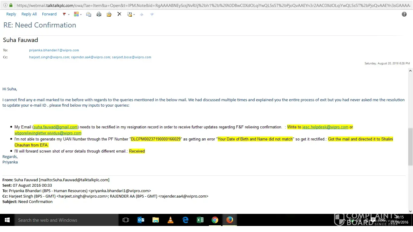 I have left Wipro on 31Aug'16 with 2 months notice period. While submitting notice period wrong email address was updated by mistake on my resignation which was submitted on wipro portal. I requested my manager, CCM and HR to help me with this so can get my reliving details on time after 31st Aug'16.