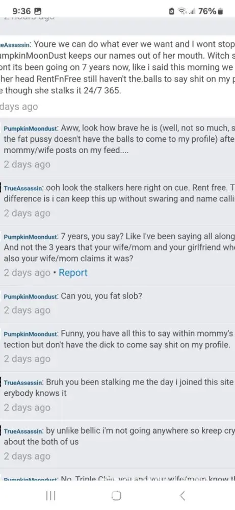 There is a very nasty person. Named Pumpkin Moondust. The site allows him/her to curse harass and bully every one on there. She's a catfish. And has physically threatened people even! I'm sure any one reading this is aware of this creep! She is some how allowed special privileges by the satanic mods. There's no time or date!because it's all Day everyday
