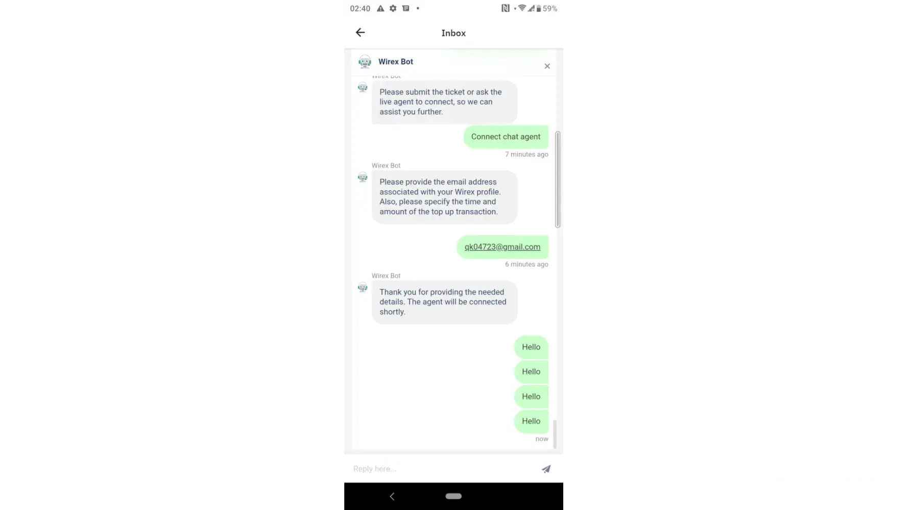 After contacting my bank, they informed me that they haven't received any remittance transfer from Wirex Limited to my bank account.