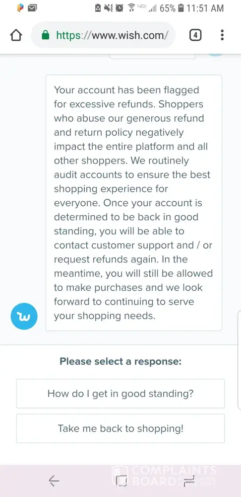 My account has been flagged due to excessive refunds. Two of the refunds were for defective/damaged items. The other seventeen refunds have been for items that I have not received. There are two items that have had the delivery date changed twice, both now overdue. I could find nowhere to state my issue, I’m encouraged to purchase more to bring my account back to good standing. There are an additional four items yet to be delivered. Whether I receive them or not I will be closing my account. I would advise everyone to boycott Wish, spend your money elsewhere!