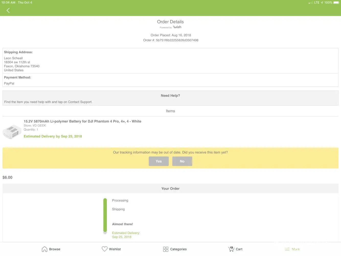 I bought this 15.2V 5870mAh Li-polymer Battery for the DJI Phantom 4 Pro, your seller had it marked for either $5.00 or $6.00 and 5 or 6 shipping with a total cost of $11.00. It was supposed to be here on the 25th of Sep. I requested to get the tracking number from wish and VD GEEK the seller, but oh yeah instead of giving me the shipping information and actually sending me the battery you refunded my money. I DIDNT WANT THE DAMN REFUND I WANT THE BATTERY I ORDERED FOR THE PRICE I PAID, NOT MY FAULT YOU MISS PRICED IT. UTTERY DISCUSTING THAT YOU TREAT YOUR CUSTOMERS WITH SUCH DISTAIN THAT YOU CANT HONOR THE PRICE YOU SET, BUT INSTEAD WAIT UNTIL THE CUSTOMER COMPLAINS AND REFUND THE MONEY SO YOU DONT HAVE TO SHIP THE ITEM OUT. I WILL NEVER BUY ANYTHING FROM YOUR COMPANY EVER AGAIN.