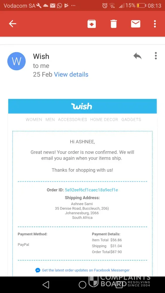 I accidentally bought around $200 worth of items from the wish app, and I went and cancelled all of them and made sure to say to put it back on my card, they said it would take up to 2-3 weeks. I never received any money back whatsoever. I have no idea what to do and have tried countless times to complain but I have no idea where I submit a complain at. Please help me, my number is [protected]