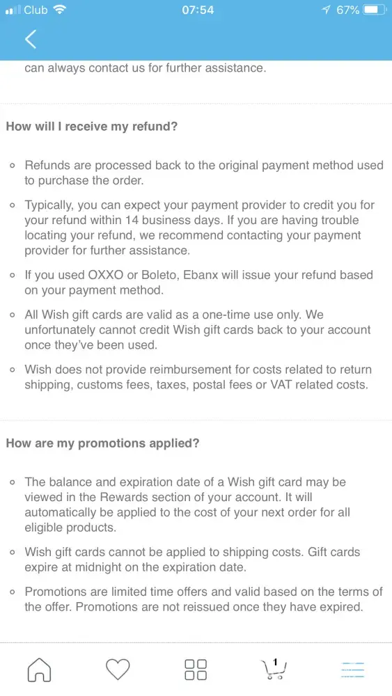 I didn't receive the items I ordered so I was given an option to get wish cash instantly or money returned in a few days. I decided to take the wish cash and got $60 dollars. Once I got the wish cash wish locked my account and wont refund my money, I have tried contacting them several times and dont even get a response. Wish is a horrible company and needs to have a class action filed against them.
