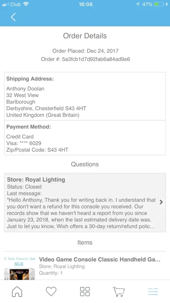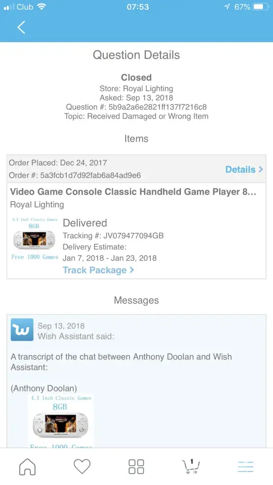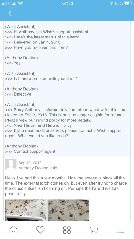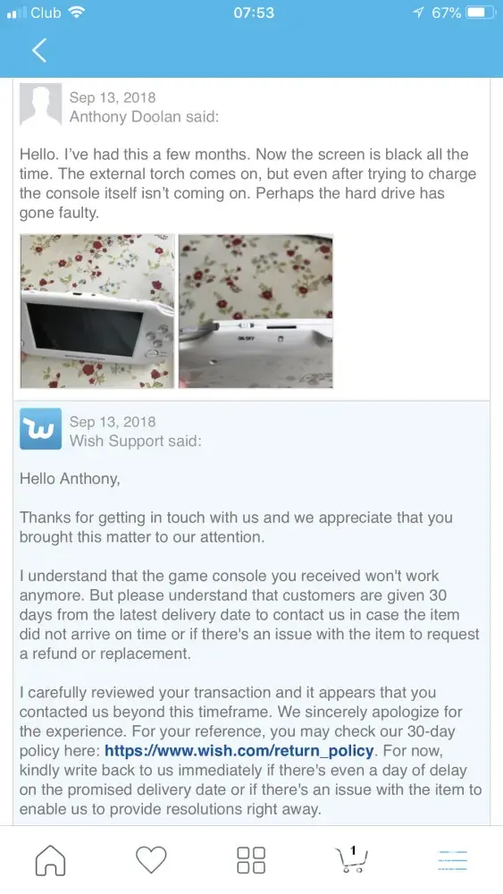 Hello. I bought a Gameplayer from Wish in January. It's since became faulty. They say it's out of the 30 says refund policy. I'd like to point out that they could still send a replacement or offer a voucher but instead they have closed my complaint. Usually electronic items have a years guarantee. They seem to ignore my request and just close the complaint. See attached.