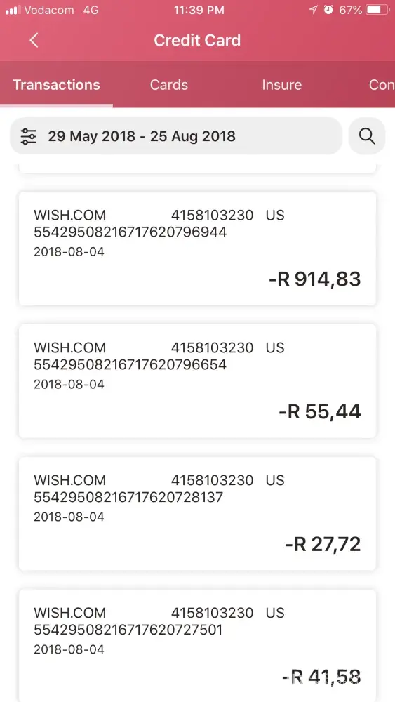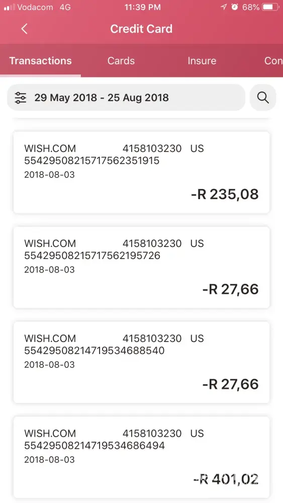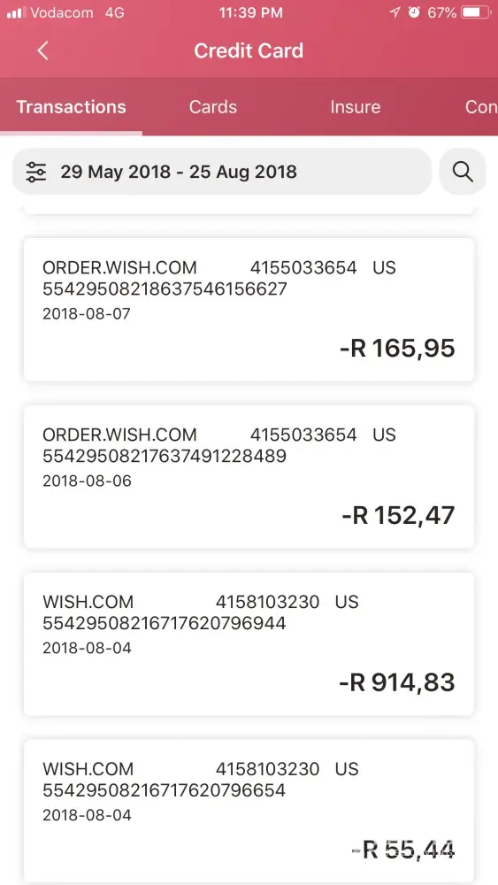 Wish was purchased of amount $164.00 on may 3, 2018 and march 2 2018 amount I forgot it goes back to February 2, 2018i am homeless need my credit back I have nothing and im hungry and need to pay a bill. Please refund me my credit back I think I deserve it my po packages never came business fedex OK ved and never received packages or refund can j get my refund now I've been wanting it and waiting for the longest card ik still have