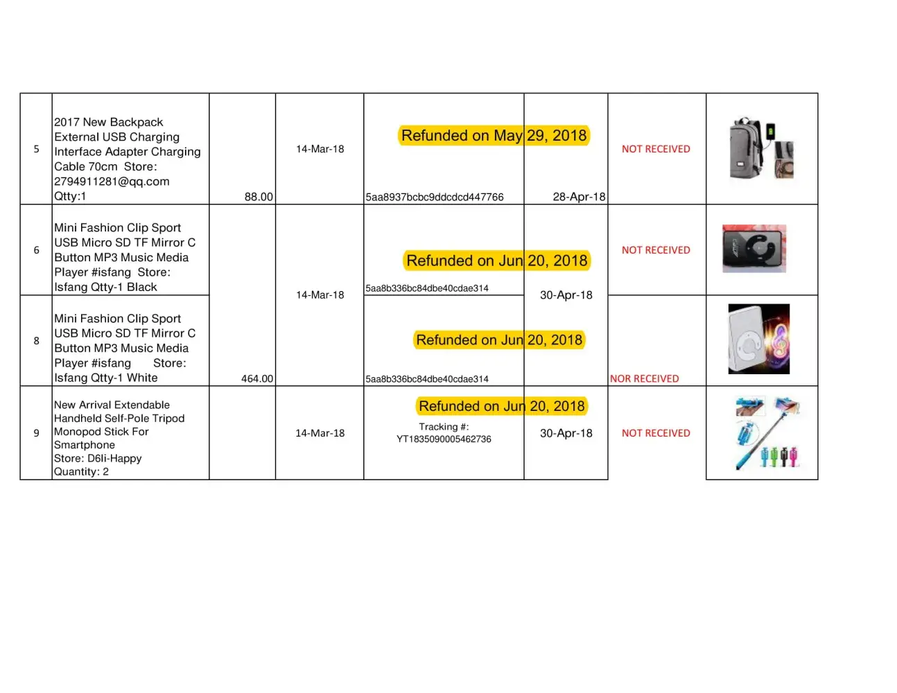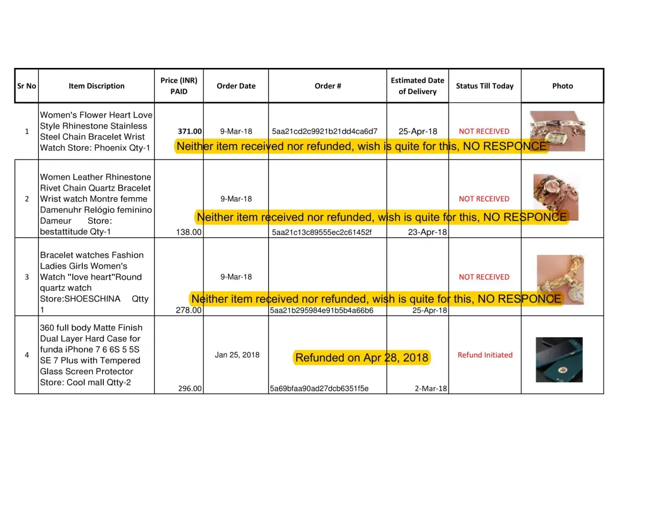 4. the attached list have updated information in highlighted text and Item endorsed at # 1, 2, 3, 10, 12 &13 are not received and even wish.com not refunding my amount too. The whole amount is figuring out as INR 1313.00 (US$~19.00)