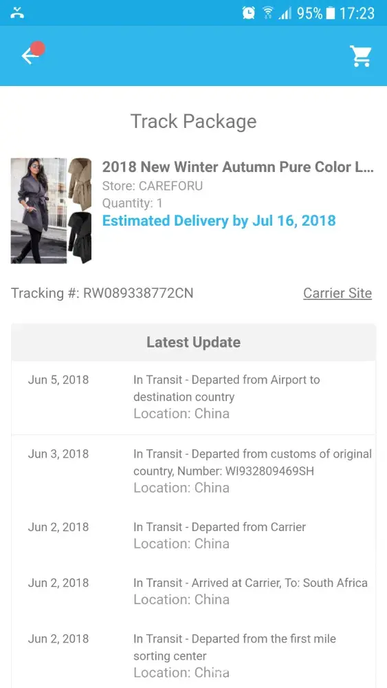 I placed my order of the 2018 New Winter Autumn Coat on the 29th May 2018 and was told it would arrive on 9th June 2018 then a few days later it exceeded to the 16th July 2018. I would just like some feedback and confirmation of which date my package will arrive.