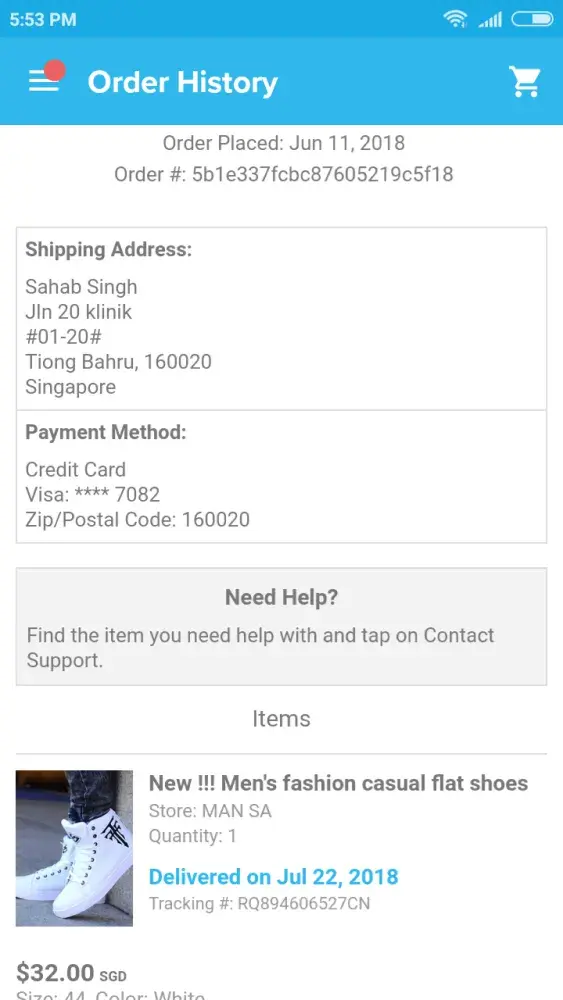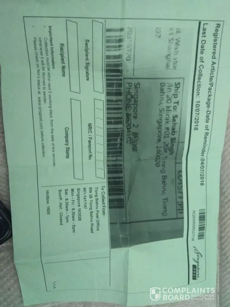 My name is sahab singh . My order no i post wit photo option . I had bougt a shoe with wish .com online from Singapore on june 11 The date they give me to recive my sheo on my address is 22 of july but i didnt recive any sheo then on 22 of july i recive a latter for recive your she from tiong bahru blok no 128 post office the recivie date on the letter is 10 of july then same day i go post office on 22 july post officer told me ur late to recive your product then they send back already my product to wish so now i need back my product my contact no +[protected]