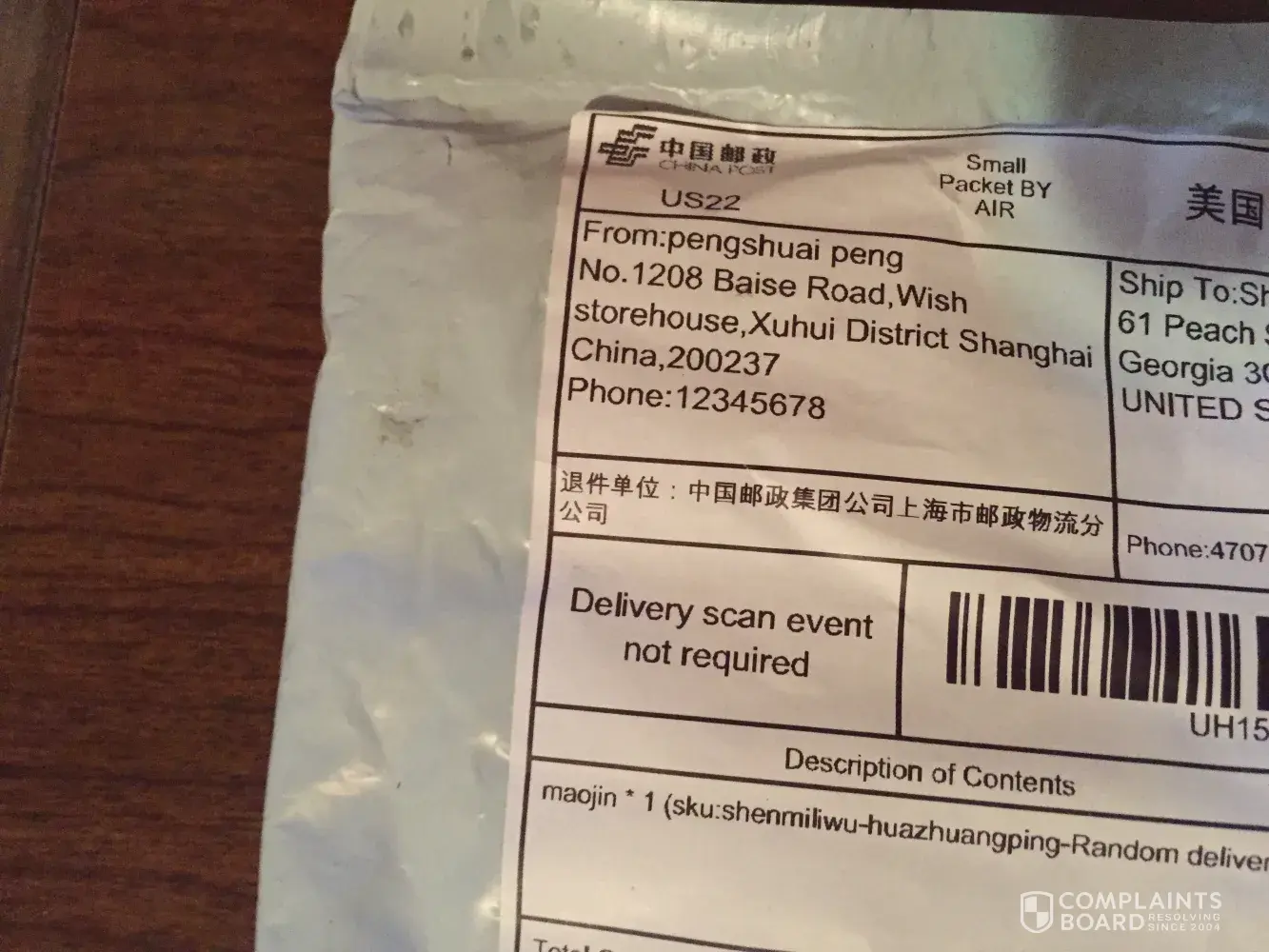 Wish.com will 'investigate'. Wish.com states it has no way to create separate label. "use at your own risk."