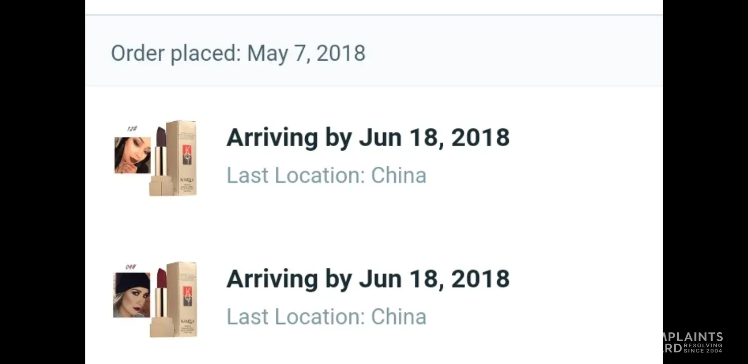 I have ordered two (2) *12 Colors Waterproof Matte Lipstick*. Arrival date is June 18, 2018, Sunday, today is June 17, 2018, Saturday, I haven't received anything. I ordered and purchased 2 of this product, #12, and #04. I would love to receive the 2 items or a refund of 4.00 dollars, 2.00 dollars for both items. I have tried to submit a complaint on the Wish App, but there's seem to be a problem with doing so. Please issue me a refund so I can re-order the same items again, or re-send the items that are mentioned in this complaint.