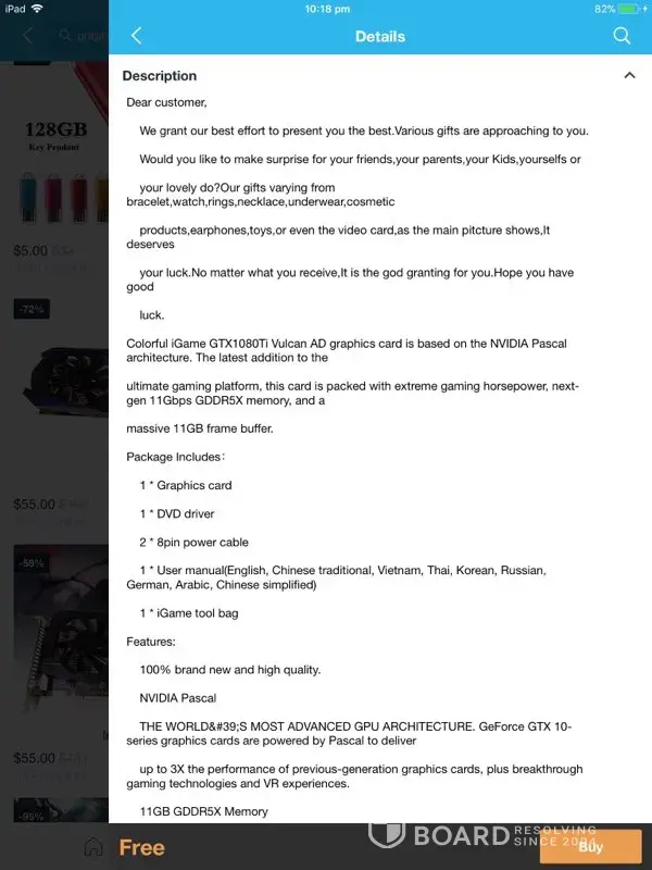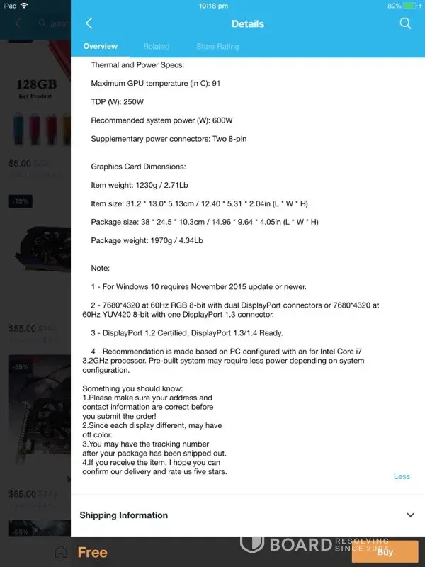 I ordered 2xColorful iGame GTX1060 U-3G Gaming Video Graphics Card 1556-1771MHz/8008MHz I2M5 Video Card... checked the description all the clock raitings and everything knowing you have to check before you buy... now my item is shipped and in addition its now : — Colorful iGame GTX1060 U-3G Gaming Video Graphics Card 1556-1771MHz/8008MHz I2M5 Video Card Power Cable and description is now a cable nuthing else the item has been changed from this as we screen shotted this view attachments.. this is what I purchased and paid for