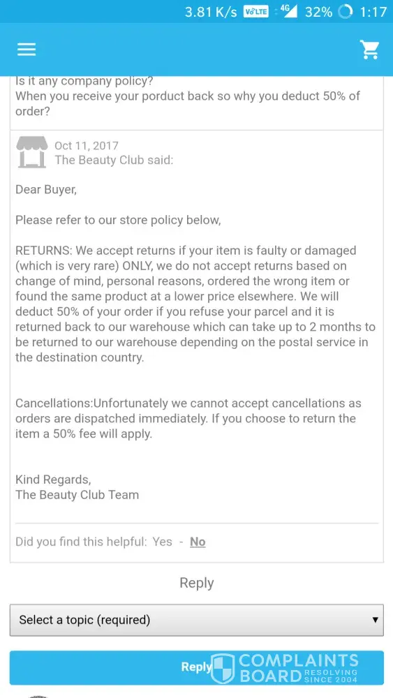 So merchant told me send back a return policy '50% deduct of order amount'.
