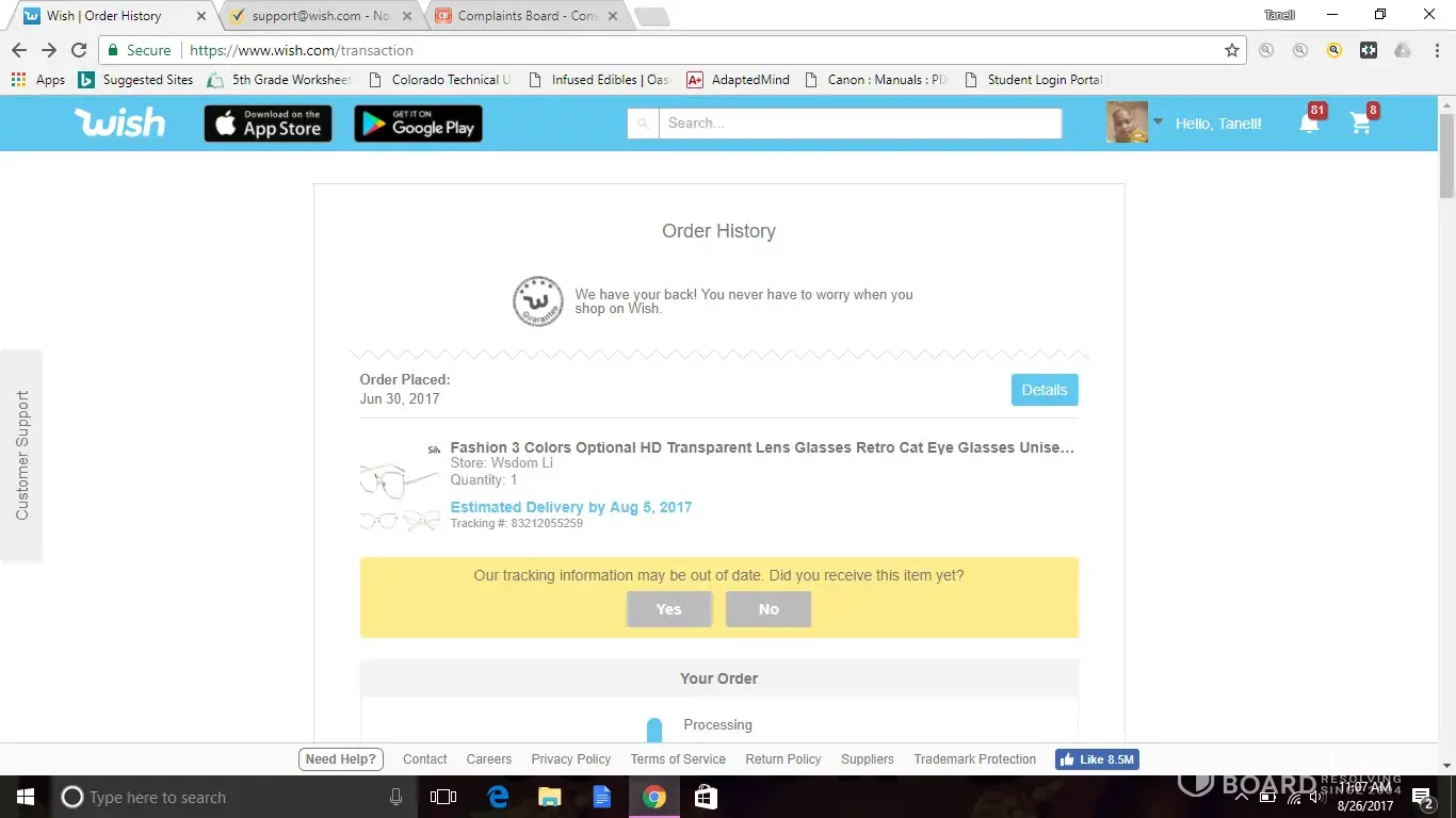 i placed an order with wish on June 30 2017 and it was suppose to be delivered Aug 5 at the latest i received one product early. after that i was expecting my next 2 product to come within a few day. i still haven't received them and have put in many complaints. my order number is 5956c57576460a2e4e2e5fd9 and that is for
