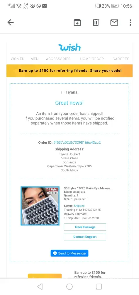 I orders eyelashes on Wish.com from a store named abiaojiaju on the 9 September 2020. I was not able to track my order since the 16 October 2020 and was unable to even get any help from Wish Customer support via the app and via email. My order was supposed to arrive on the 4 December 2020 but nothing has arrived either.