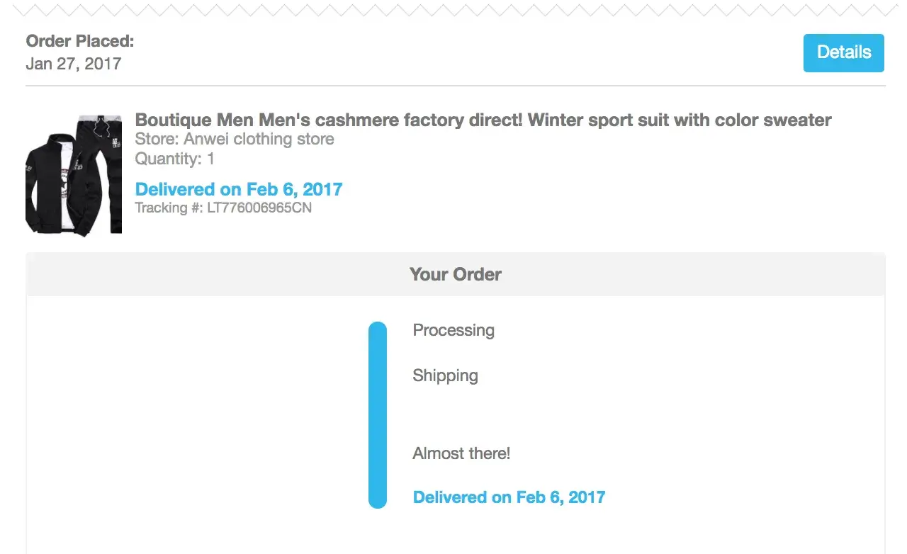 I placed an order for a Romance Wedding Bouquet Bridal last January 27, 2017. A white & light blue combination from zhiangbo - store and the estimated delivery is March 10, 2017 with the tracking # of [protected].