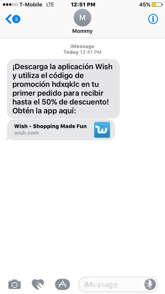 I am really disgusted my mom send me a code for promotion on wish for a 50% in my first order, I download the app, i created an account, and I started choosing the products I loved and then when I was about to pay I add the code and it doesn't work, I think is not a good idea to make people happy because you are offering a discount and then the discount doesn't work like it suppose to