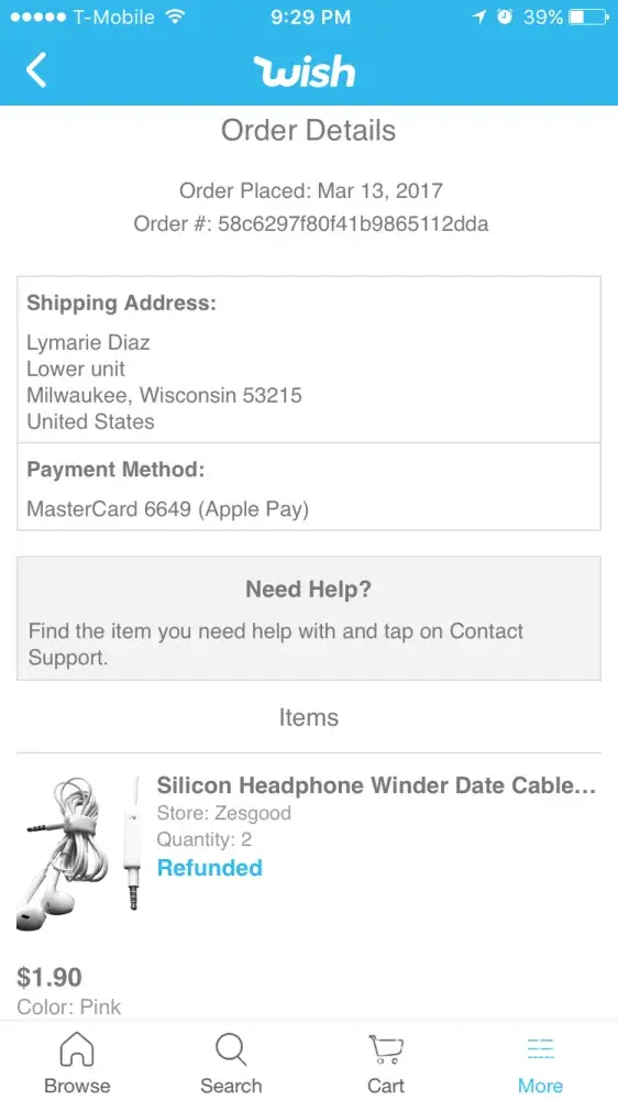 I ordered 2 headphones for cell phones on 2-28 with the understanding that they would be set to me by 3-20. I t is now 3-24 and I have not seen anything as of yet. There is no contact by WISH either by mail or messages as to the problem associated with mailing procedures. Please advise.