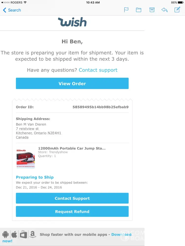 I ordered a product with order number 58589495b14bb98b25efbab9 on wish.com in December.