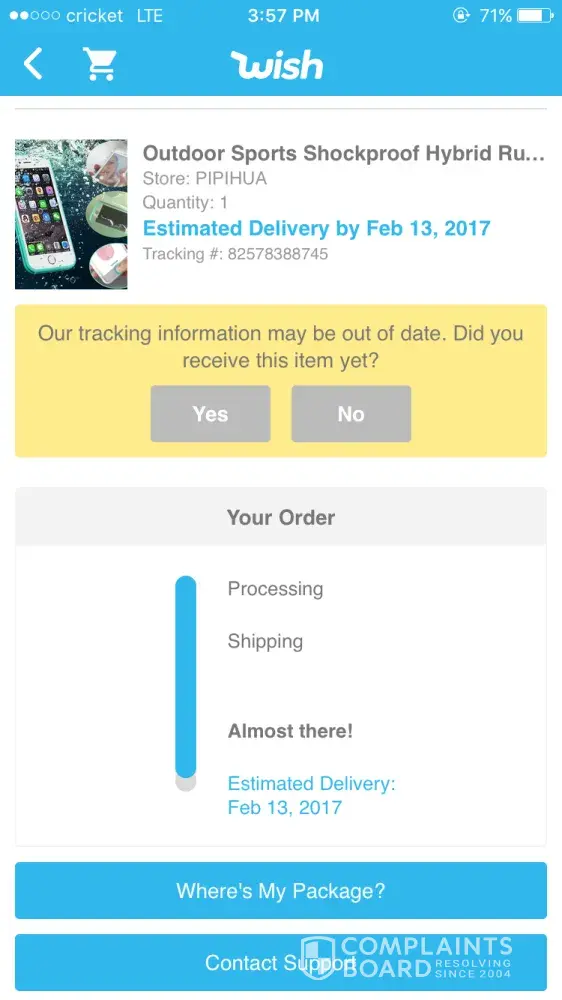 I made my order about a month and was supposed to receive my item last week but nothing arrived. I'm super nervous about this because I have no idea what to do. Everything that people said about Wish is true! There is no way to reach anyone and get help. All I can do is wait and hope, but I don't expect a happy end.