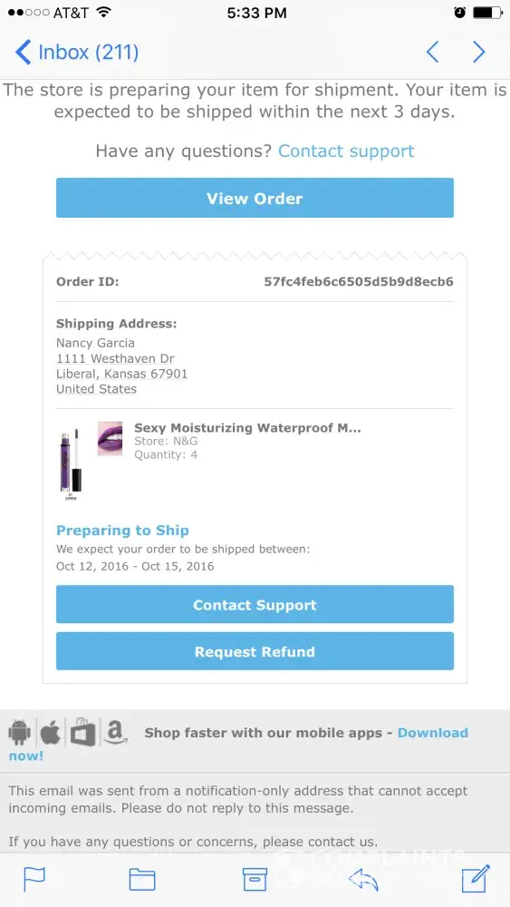 This is crazy. I'm so sick of scams and ordering off the internet, bc of places like this. If someone orders and pays for their items - how hard is it to ship them!? And no responses make it worse. The world doesn't even have the decency to make money legally anymore or give someone a heads up on paying for nothing! During christmas too. Smh. When ppl are their brokest. Thanks wish.com. U lost what could've been, a good customer.