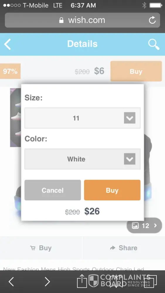 I signed up for wish.com and was offered a free pair of earrings for signing up. I paid one dollar for shipping. Next thing I know I have 62 dollars taken out of my account for shoes I didn't order. There's no way to get in touch with anyone to cancel orders or to get a refund. I was supposed to receive said shoes by January first. The website says to take a picture of the item for a refund and to send the item back. I have yet to receive these shoes, and still can't get my money back.