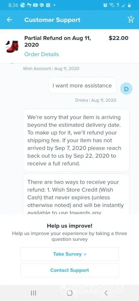 I purchased a pair of boots 4/30/20 . I was suppose to receive them 8/7/20. When I informed them of the delay 8/11/ 20 they granted a partial refund and said if I didnt receive them by 9/22 I'd be granted a full refund back to my card. 9/22 when I informed them I still didnt receive my boots they told me it was too late to get a refund but that they would make an exception and give me store credit. That's just outrageous how they think they can just steal from their customers. I want the remaining balance back to my original payment method.