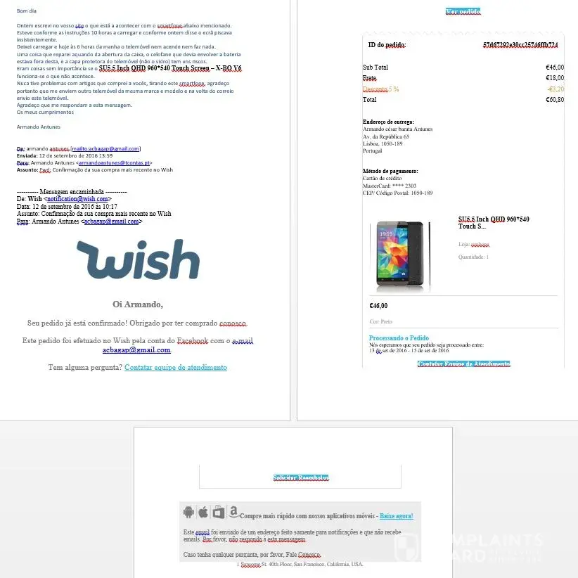 I inform you that I contacted the Portugal Chamber of Commerce and the Commercial Attaché of the Embassy of the United States in Portugal to give them knowledge of the company's online business procedures Wish.com and his bad Customer Support Service.