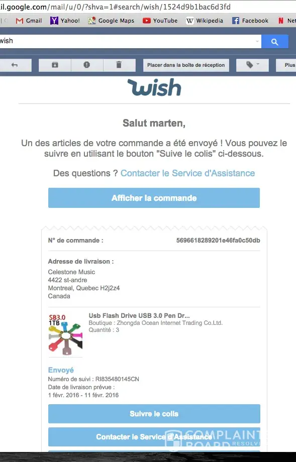 I also received your order confirmation email on 29th Jan'2016 from [protected]@wish.com