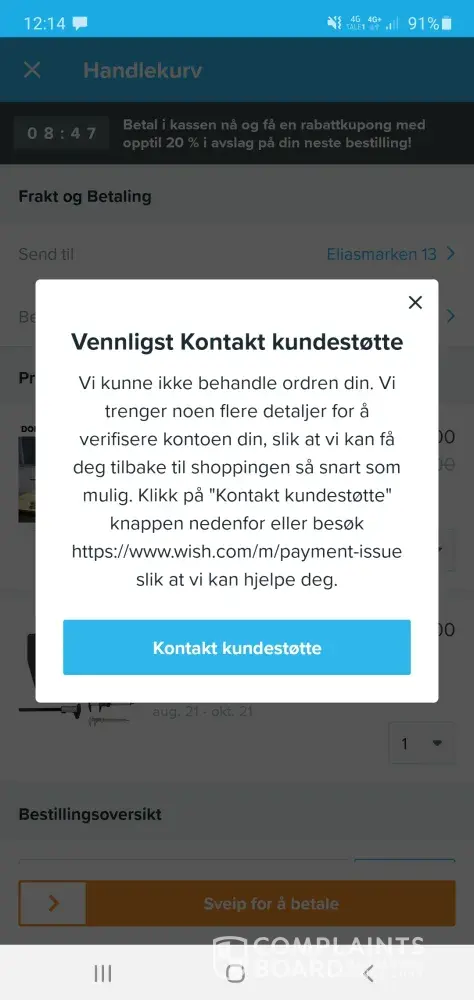 Several months ago my account security was breached on wish.com and someone tried to make several purchases in my name. Wish stopped the transactions and blocked my account, ever since i have been unable to make any purchases due to the fact that i cannot get to the payment stage of the purchase because of pop up messages (attached images) demanding proof of identity blocks me and redirects me to a automated customer service spewing out the same nonsense about having unblocked me. I still have over 1000 NOK of Wishcash sitting in that account and despite having submitted the info required several times i am still blocked. I will give you one more chance to fix this if not i will consider Wish as a non serious company and never shop here again.