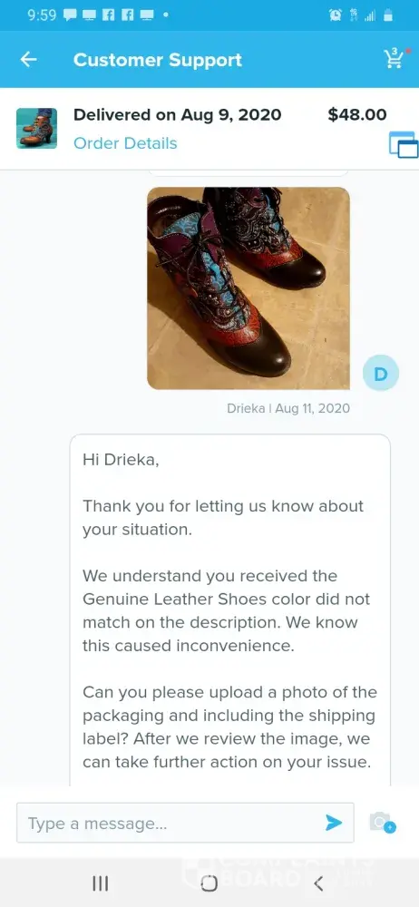 I ordered a pair of brown toe shoes in early May. The shoes I received on 8/9 were black toe. On 8/11 I emailed them my dissatisfaction of their era and attached photos as proof along with request for a refund. They then tried stalling tactics by again requesting additional photos fabricating stories about me ordering 2 pair of shoes when I know i orderered only one brown toed pair which is verified in my order history on the account. I am yet to see a refund! Below are the emails between the customer service representatives and myself. The 3rd photo are the shoes I received. The last photo and the small photo in the top portion of the emails are the shoes I ordered clearly 2 different colors.