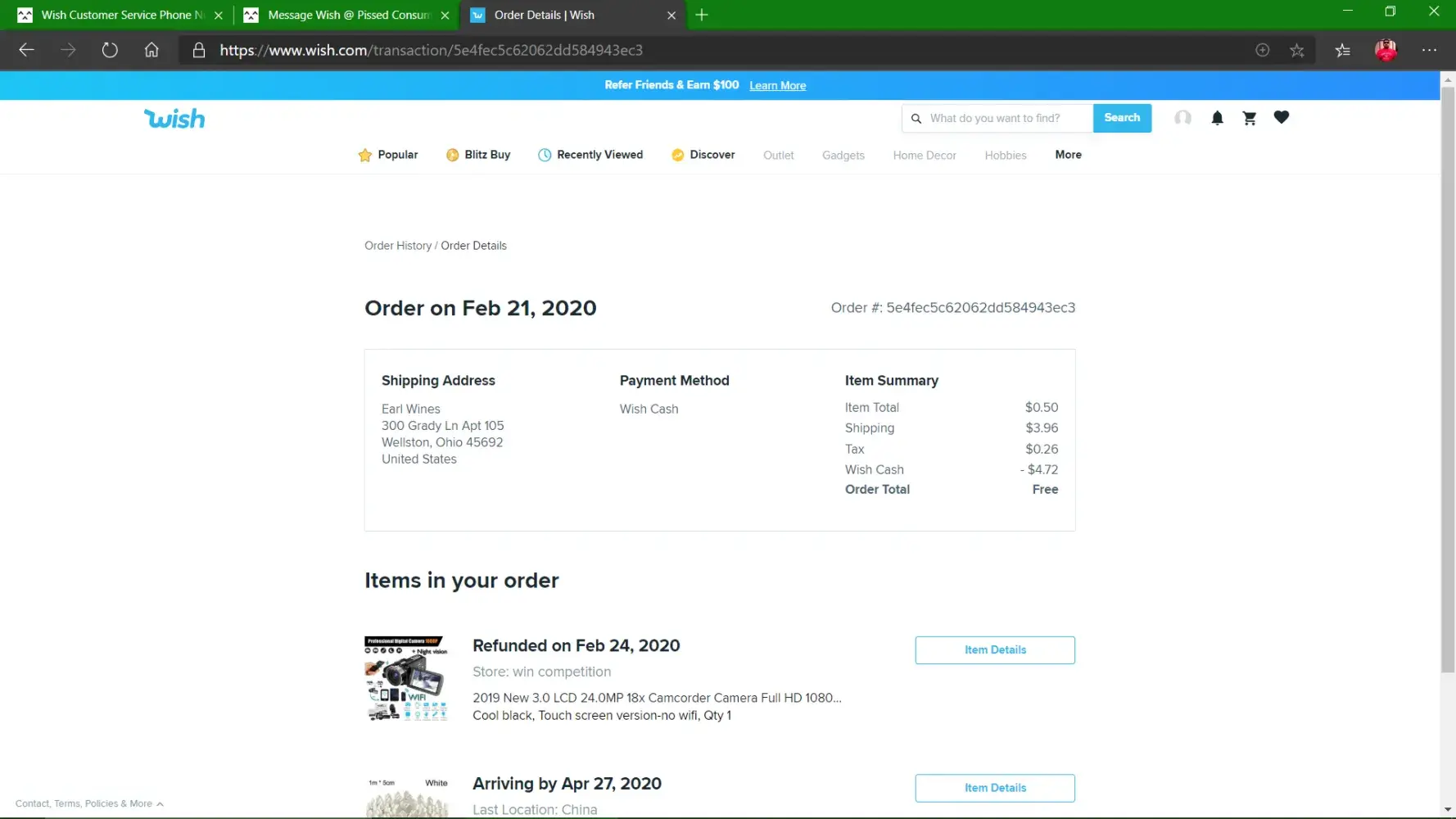 On 2-21-2020 I paid $0.50 for a camcorder that was being offered as one of the Daily Deals on Wish the very same day on 2-21-2020 I received a facebook messenger update stating the item was shipped 3 days later on 2-24-2020 i was refunded my money back and when I asked customer support about this the tell me that my order wasn't the first one processed.In the offer it states that only 1 winner will be offered this deal and all others will be refunded within 24 hrs. They never refunded my money until the 24th 3 days after the item shipped.Idon't know why they took it away from me but I expect them to make this right and send me the camcorder that I won