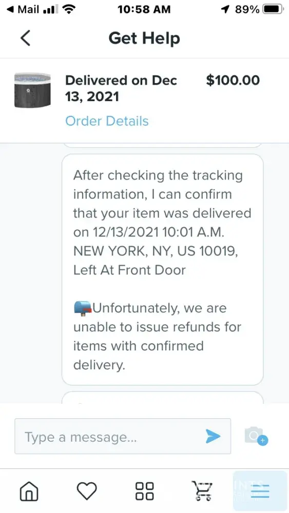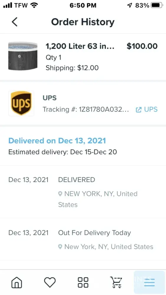 Wish i am tired of months of being blown off. Over $600 in items that never arrived. The most recent was a six person hot tub with liners cover and heating unit. I was given a fake tracking number for an item from amazon.Com to someone in new york called pp & bb for an item weighing only twelve pounds. I waited at home for this delivery but it never showed and i even had help because it was going to be at least 80 pounds. I want refunds for thaf and the other two items