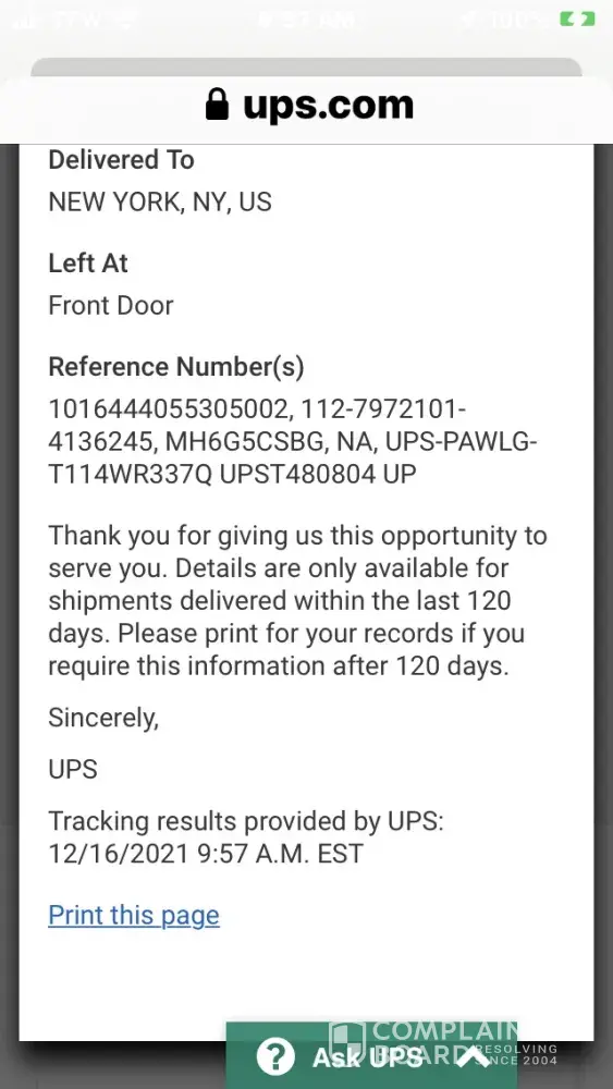 Today this item whatever it was, was delivered to a woman here in Leavenworth, Kansas, by the name of Christina. The package that was delivered to her was from amazon. The above tracking number was for her package. This information is what I got from UPS on the phone.
