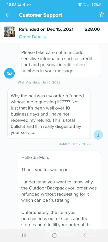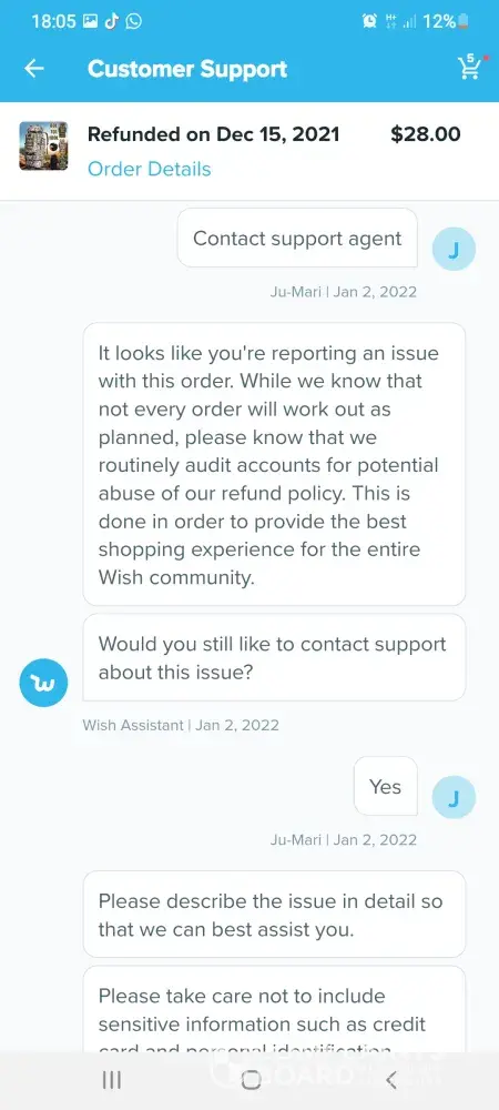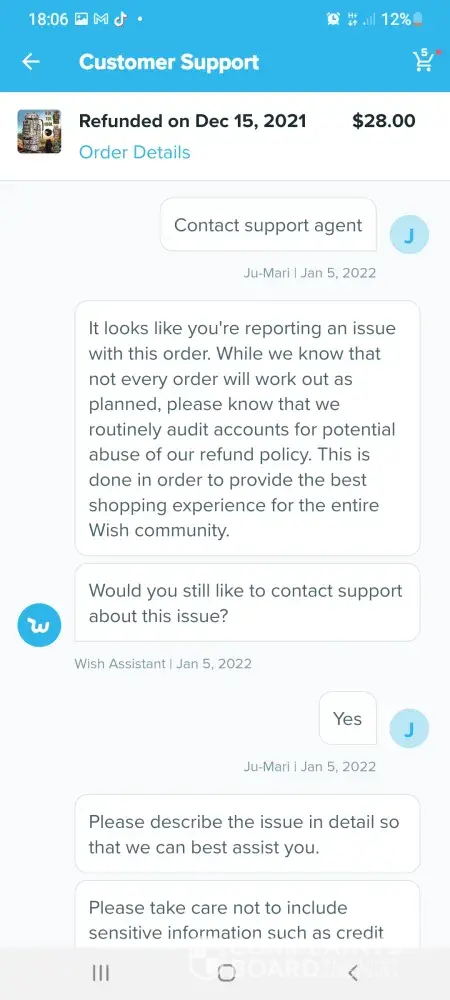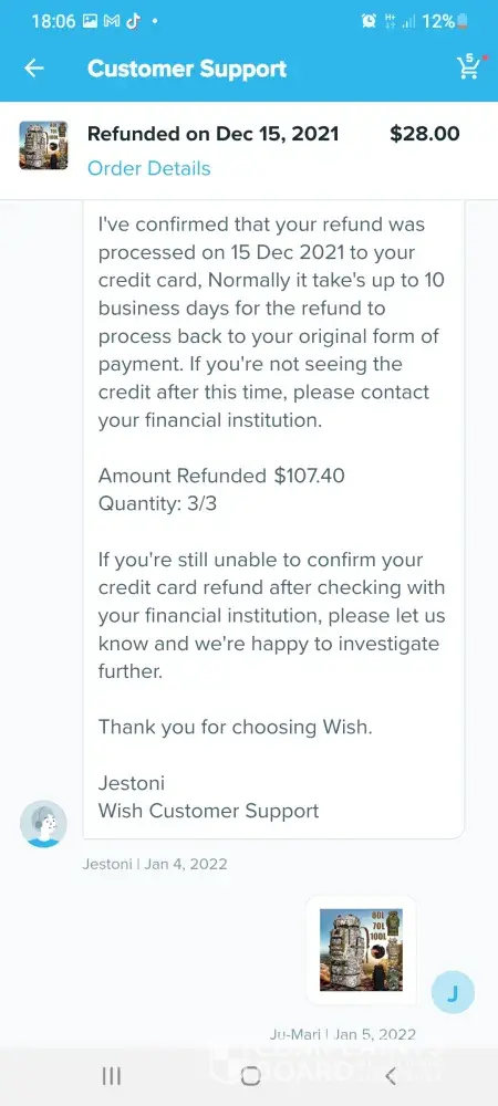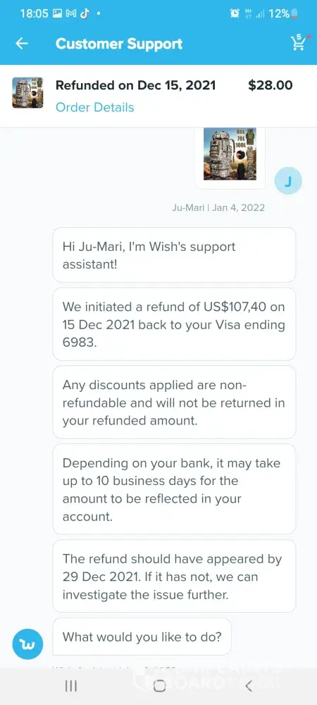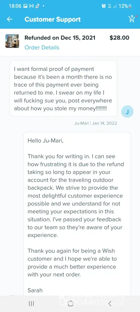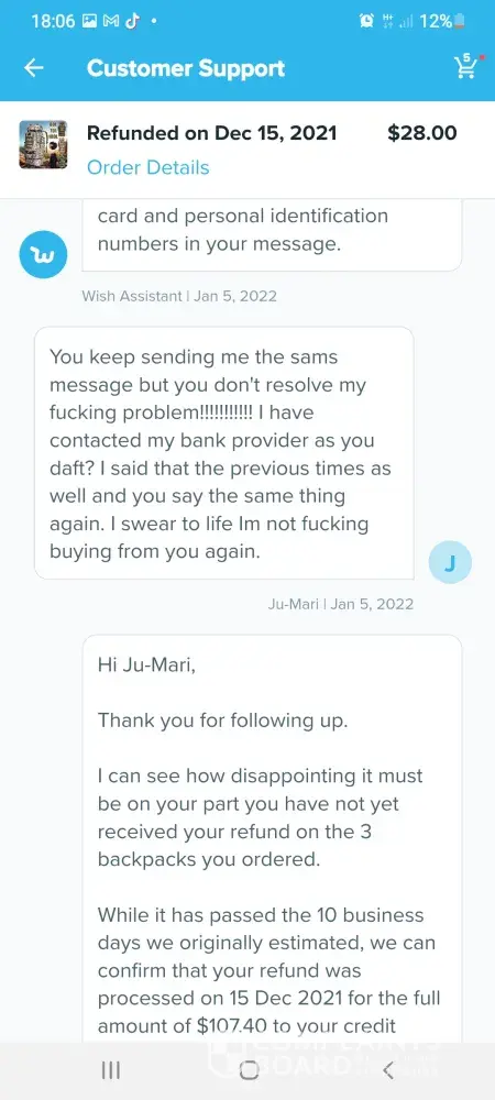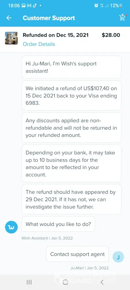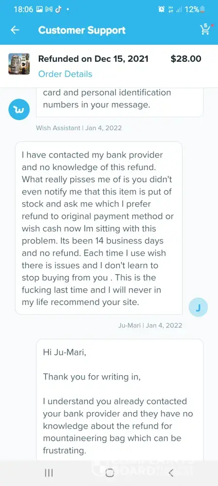Im trying to get a refund off wish but im going round in circles these are the emails which we have sent so far hi germaine im wish support assistant we are sorry you arent satisfied with your item what went wrong. Item delivered did not meet expectations. Thanks for letting us know. Can you tell me what is incorrect about your order. Item arrived damaged. I can redirect you to a wish support aggent to better assist you. What would you like to do.Contact support agent please upload one or more photos of the item and describe the issue in datail. 6 of the boxes were split so I couldnt fit them together the front of the box wouldnt stay on so when you putvthem on top of each other the front falls off they are too flimsy to stack on top of each other. Dear customer sorry for the inconvenience caused to you may I ask if this you recieved still can be used if yes could you please keep that. No it cant be used non of it can be used the front of the box keeps falling off when you put them on top of each other I need a refund. Dear customer could you install it per manual. The boxes are so flimsy when you stack them on top of each other the front falls off the fronts dont stay on I need a refund they are of poor quality I need a refund. Dear customer in order to make up your benefit wecwould like to refund you 5%of the order amount and you dont need to return this item to us. I need a refund the boxes are too flimsy to stack on top of each other the front falls off when you put them on top of each other I dont want to keep them they are too flimsy I need a refund please listen to me when I say I need a refund im a good customer of yours and I spend a lot of money on wish please dont make it any more difficult for me I want a refund the boxes are too flimsy to stack on top of each other they are not fit for purpose again can I have a refund also six of the boxes are split. Dear customer we would like to offer you 5%of your order amount item price plus shipping. I need a full refund of £70 pound which is what I payed I have been in touch with tge citizens advice bureau and im perfectly within my rights to get a full refund. I need a full refind. I am going to write a complaint letter if this doesnt get sorted quicker. I shouldnt have to ask fir a refund this many times. Sorryto hear the item which could not work normally (doesnt even make sense) we would like to offer you 5% of order amount which is item amount plus shipping fee. Each item would have been quality checked when its out of the warehouse. Suppose its not big issue (dont know what they mean by that) could you let reoair man fix locally. Ifvit could be fixed would you like to keep this item. For the 6th time the boxes are too flimsy to stack on top of each other when you put them on top of each other the front falls off. I dont want to keep them they are not fit for purpose. Ivwant a full refund of £70pound I couldnt be more clearer I need a full refund I dont want to keep them. If I dont get a full refund when you txt me back im going to write a letter of complaint. Please hurry with your reply im pulling my hair out at this very slow process