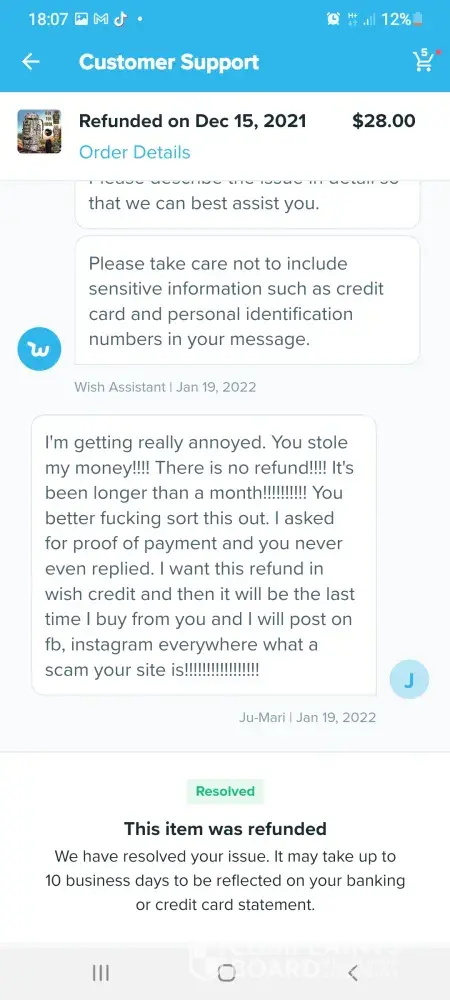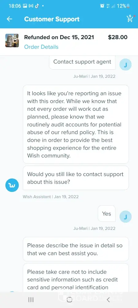 I purchased a men's titanium skull bracelet, a stainless steel cross of lorraine ring (size) a swiss army watch and a multi colored face watch. The package arrived late and when I opened it nothing was right. The bracelet had been swapped out for a small stack of little kids stickers, the ring was swapped for a chrome plated boys ring, the swiss army watch was broken (the case was cracked and the crystal was smashed) and the multi colored watch's battery leaked into the movement and corroded it solid. I took pictures of everything. The package and label the order came in, each bag that was inside and their labels and the merchandise that came. I contacted wish support and sent the agent everything I had. He said it would be no problem to get the merchandise replaced with all the info I sent, but it would take 2-3 business days to do and he would email me when my order reshipped. The next day I get an email from a different agent asking me for the same info I had already given to the first guy. But I figured that this must be the girl thats going to reship my order. So I send her all the pics. 2 days later I get another agent saying that they solved my issue. But the email asked for more in fo to be able to process my claim. So I contacted wish support and ask what more info they needed. I was told "a detailed description of every item in the order. So I sent word for word what each ad read, cost, tax and shipping. 3 days later. I get another email saying they've solved my problem, but it read that they needed more info. So I contacted support and asked what info they needed. The girl wanted me to give her the upc codes from each package and the shipping bag. I told her that the only way I could give her that info was if I had one of her code readers and access to her data base. To make a longer story short, 12 more agents later (and not one of them can read, I swear) each one asking for the same info. The last one tells me that if I don't give her the info she wants, i'll loose my right to the merchandise and a refund of my money. Well I lost it cause now i'm being threatened with them keeping my money when they know that I can't give them any more info than I already have. So I sent an email telling them I was sick of all the run-a-rounds and demanded either my merchandise or my money. I've been locked out of my account since, but they keep sending me emails asking why i'm not responding to them and that they've solved the issues with my order but I need to contact them to close out the ticket on my file. I haven't seen penny one in my bank account as a refund and no packages have shown up at my door.