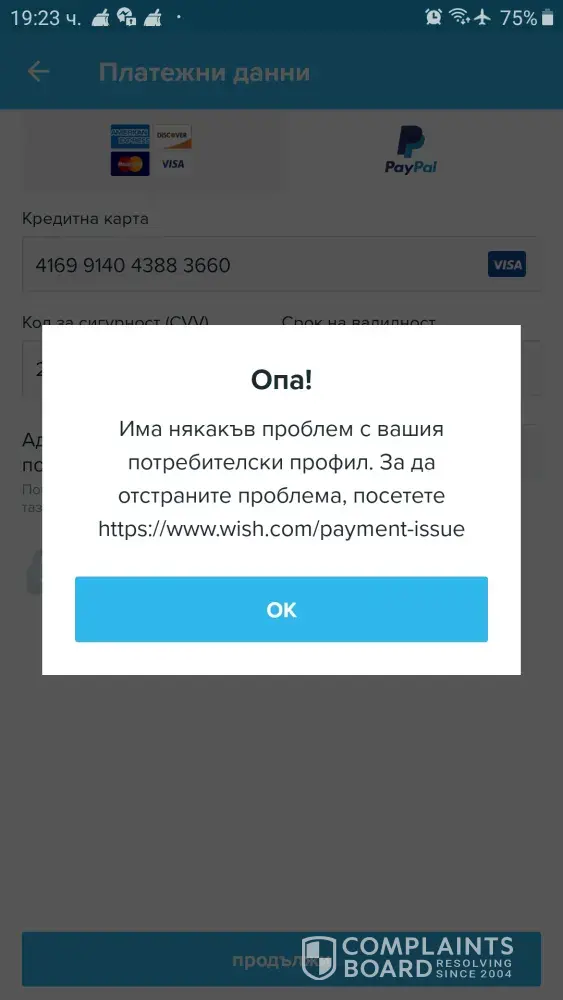 Before this, I received a message asking me to send my photo ID and photo of my debit card. I have sent it several times but did not receive any response.message appeared Lately, the abovementioned -"There is something wrong with your user account. Please visit https://www.wish.com/payment-issue to resolve this."