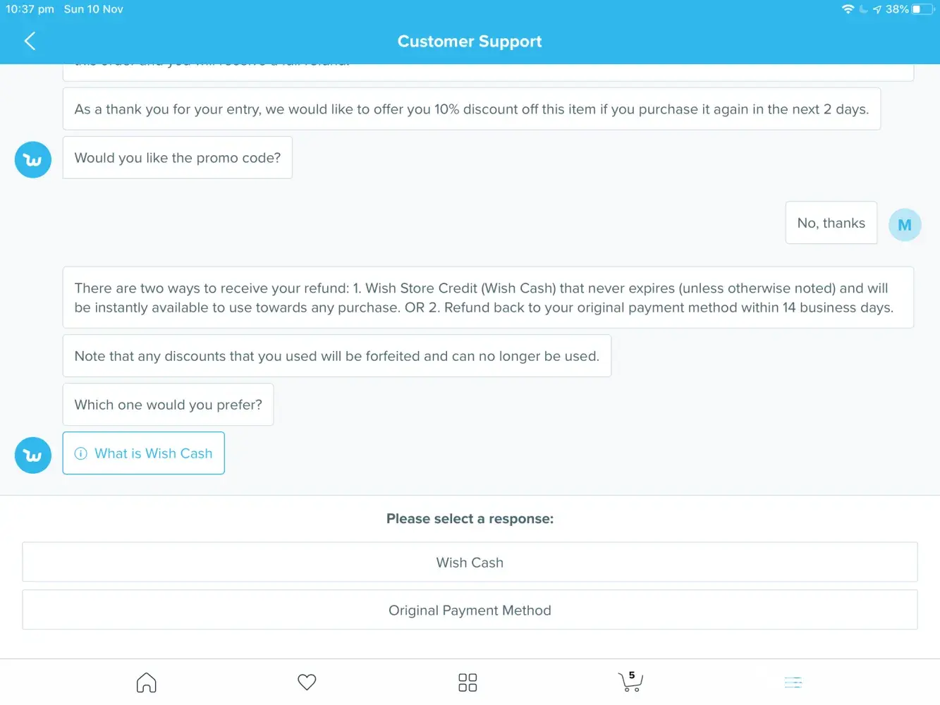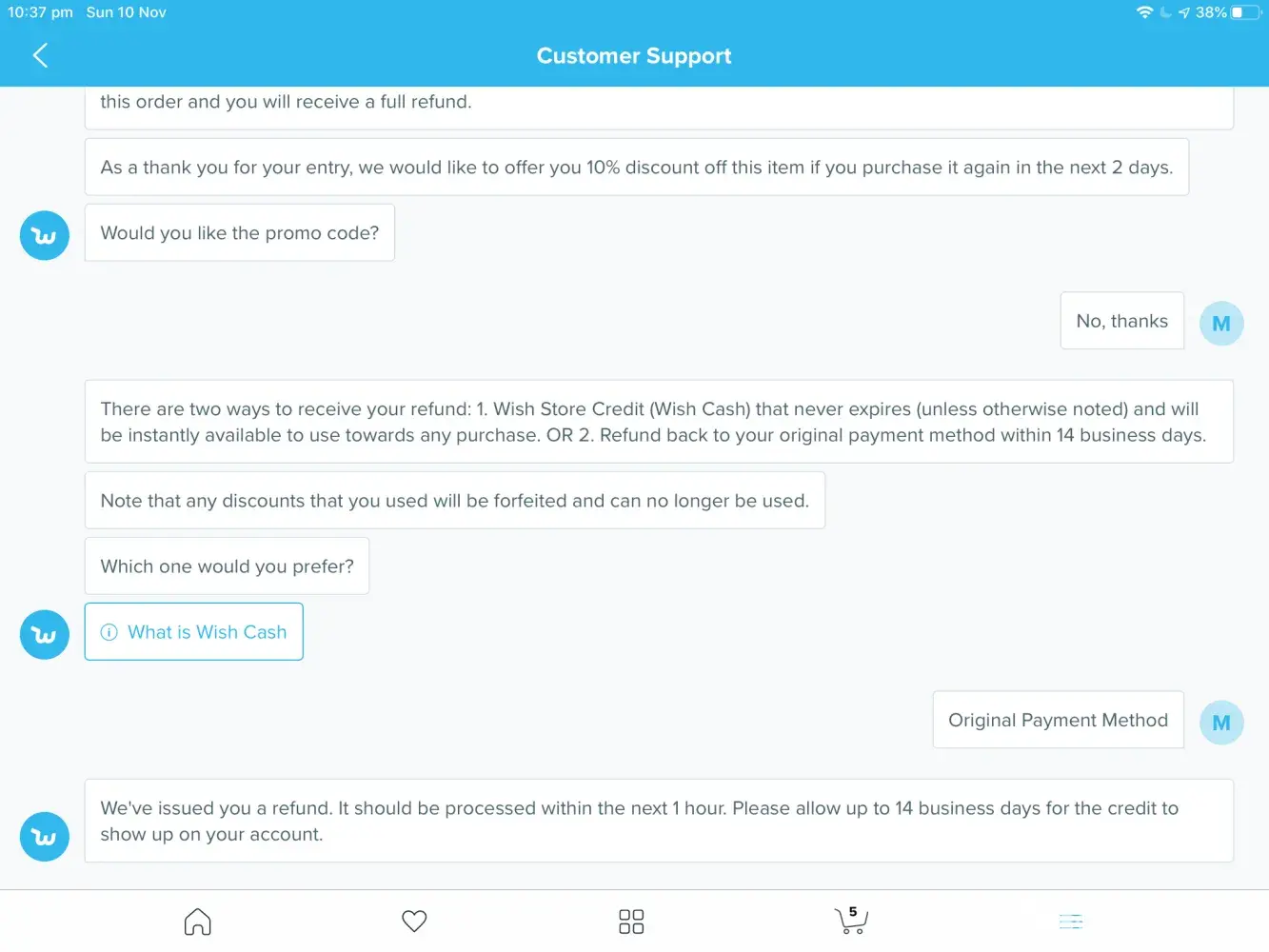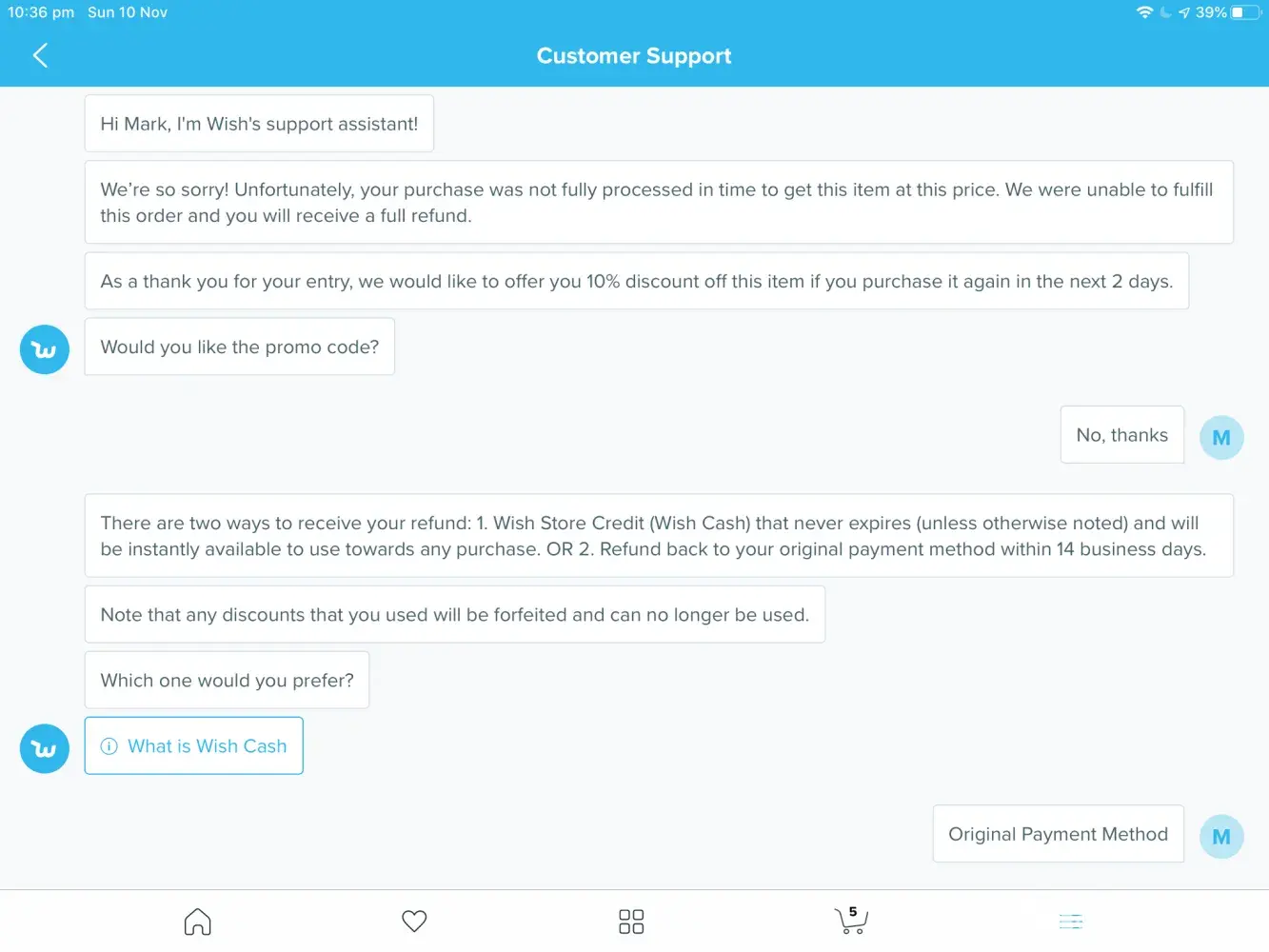 Recently I purchased few products from Wish.com only to be told that it was a one only deal per day, meaning that I could buy it for the asking price and fully pay for the item and the amount stated for shipping and the money get charged in full to my credit card, then few days later, I get to be told that I was not successful in purchasing that item...apparently the deal is such items gets advertised really cheap, so many people can buy and fully pay for it and the payment fully process and the money goes to Wish, then they select one person only out of all those people who paid for the same product, that person (if really exists) gets the product for the advertised price and everyone else miss out, in that case, you gave to go online and process how you want your refund paid, either original payment method and in that case you need to wait around 14 days to get your own money back, or you could choose to have your credit as Wish Cash, if you choose Wish Cash as your refund, you're meant to get the credit on your Wish account to use for other purchases, however, any Wish Cash is not refundable in future.