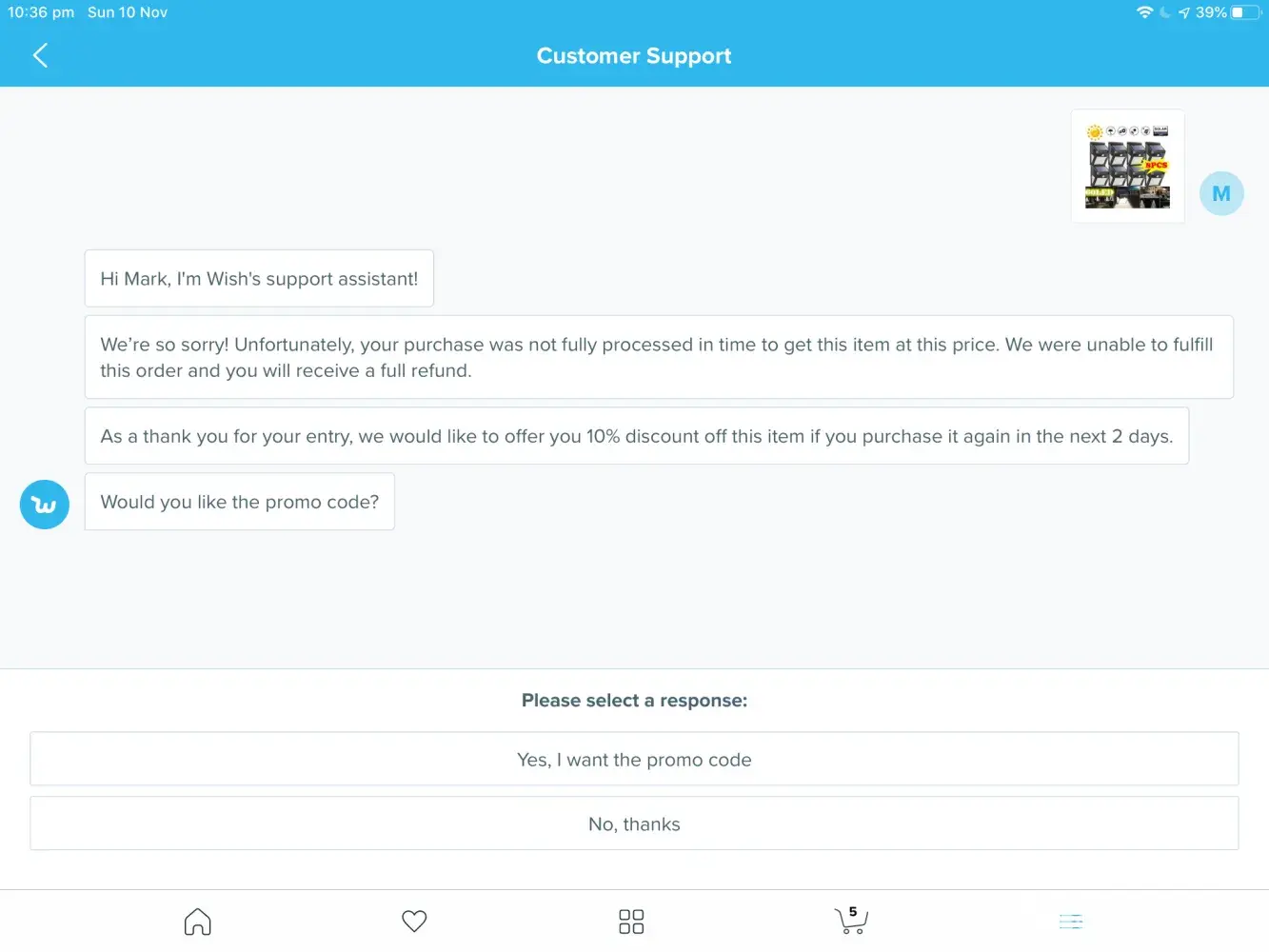 If this is not resolved in the next few days, I will contact the BBB and an attorney and tell everyone how bad the customer support is at Wish.