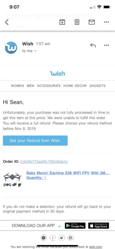 This email is a service from Wish. Delivered by Zendesk | Privacy Policy