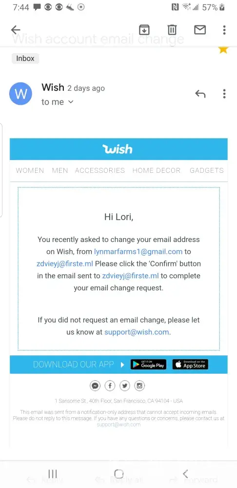 "[protected]@eveav.com" this is the email address which requested to change it and i got email from WISH.