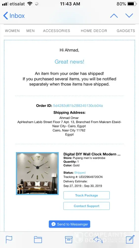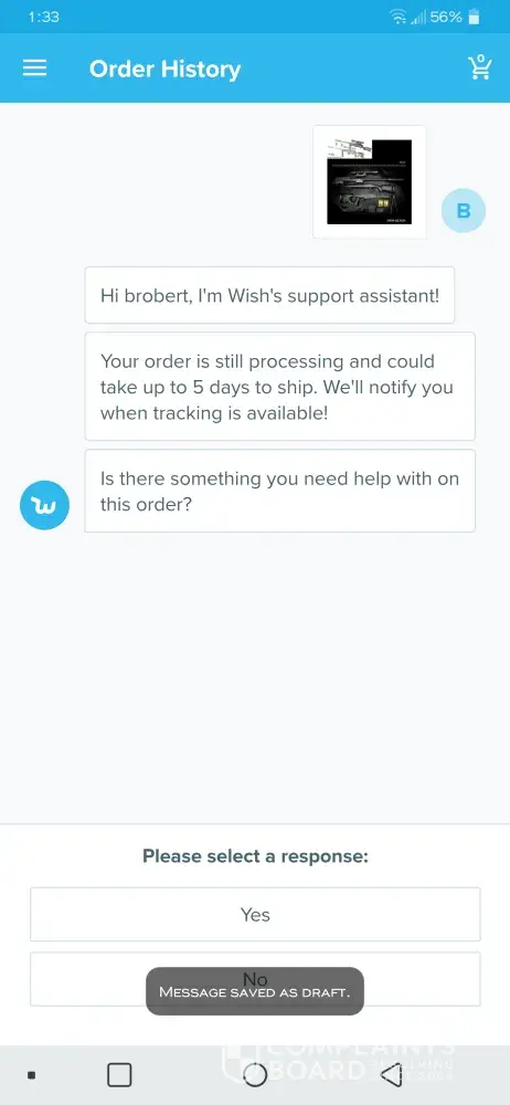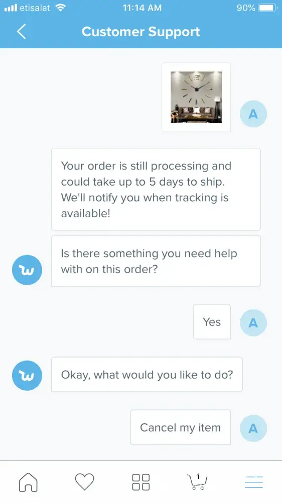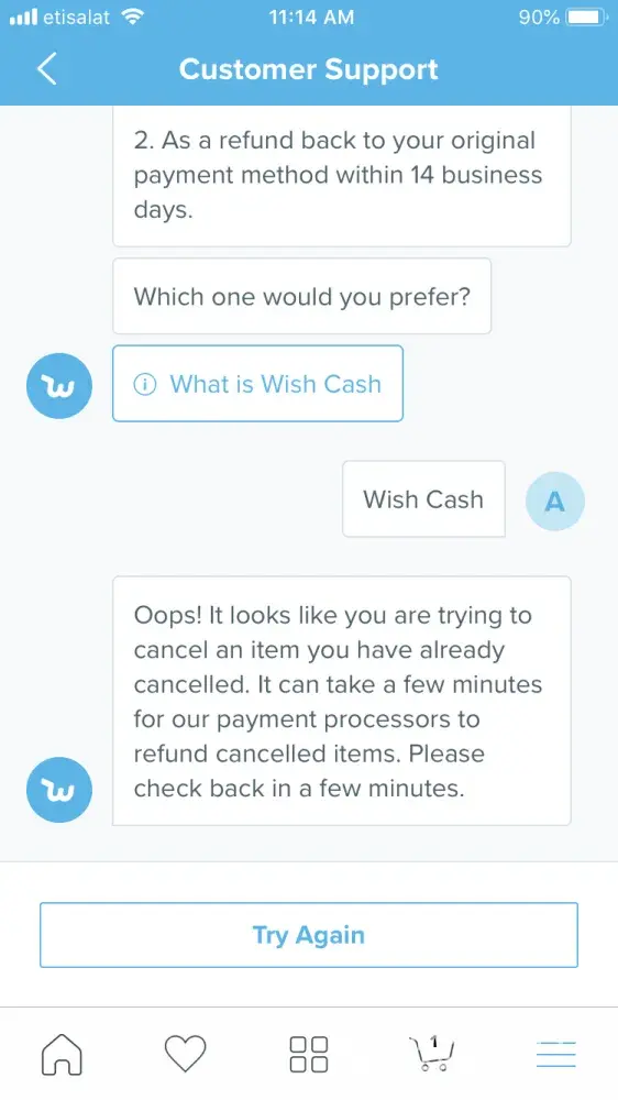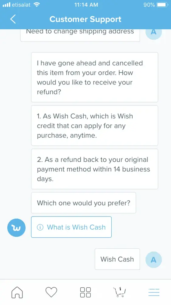 I lost hope in him so I tried to resolve problem by canceling through the stupid autonomous menu to be refunded as "Wish cash" and re-ordering, unfortunately as a stupid menu it says your order is previously cancelled which is not true my order is present as shipping.