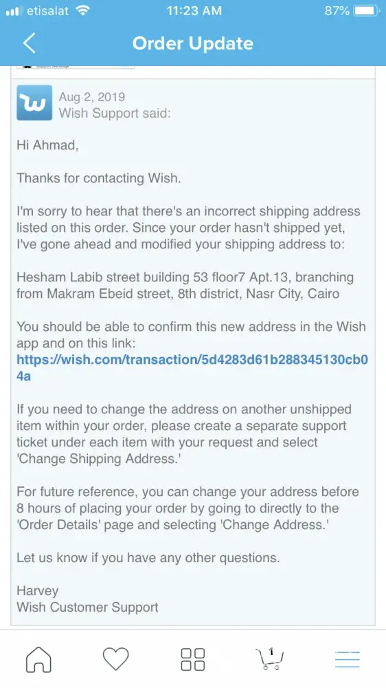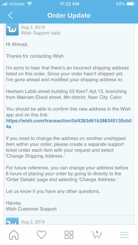 One of your employees called Harvey replied that he changed my shipping address of one of my items as requested, however after rechecking my address is still the same on this order! So I replied please confirm that you changed the shipping address because it shows faulty address in order details, I even attached a photo showing a screenshot with that, carelessly he just copy pasted his reply as if am speaking to a robot! Which I wouldn't mind if my problem got solved. However after double checking faulty shipping address is still present 👎ðŸ»