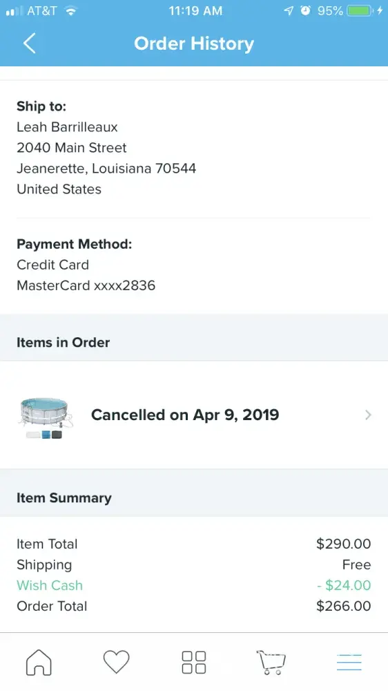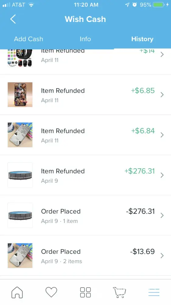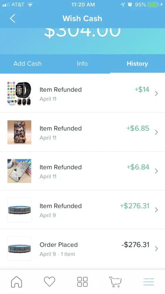 I received an alert on my phone that I had ordered a pool and a watch that totaled 315.00, which I immediately canceled the order and they refunded me but not back on my credit card like a refund should have been done. Because that's where They took my money from and when I sent them an email stating that I didn't order this they put my account on a block . I've tried numerous times and still no respond . I have never received anything and they refunded my account but to wish cash . I'm trying to get my money back to my credit card to cancel my wish account and be done but if I do that then the 315.00 will not be refunded . It's my money and I have nothing that was ordered so I just want my money credited back to my credit card account and they won't so that's stealing from me because there is no way to contact them nor get a human reply . Everything is automated . Totally never order or set things up like this through the internet due to [censored] like this . Can someone please contact me so I can get my money and close my account . [protected]. Where do I go next
